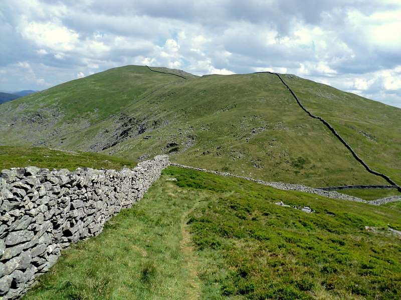 I stopped for a drink and a rest at 10.30, with views across to Crib Goch, and Snowdon's summit now visible over the ridge. There had been no sign of the others for a while, though I could hear voices below at times, and then they eventually reached me. Richard had had quite a hard day over the second half of the Rhinogs to Maentwrog and didn't get there until 19.40. He had been worried, when I last saw him the day before then, as to whether he would be able to finish in time to get a meal where they were staying. In the event, his wife made arrangements to have something that could easily be kept warm until they arrived. I set off again at 10.45 and the next bit was up a steep buttress and there was no confusing the path now, as it was quite eroded, whereas on more gently sloping grassy parts there was enough regrowth to overcome any erosion. The steep climb didn't last for very long and there was then a steady ascent to the summit.