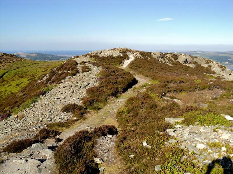 After the steep ascent of Foel Lwyd, Tal y Fan involved considerably less ascent, but was craggier and, therefore, harder and slower going. I reached the summit at 16.20 (checkpoint 39) but only stopped for five minutes there to have a drink, as I still had over six miles left to walk. There was some more craggy walking along the ridge until the path dropped down past an old slate quarry and onto much easier paths along the edge of the common, where I could make faster and easier progress. At the end of the ridge was a clearer view of Conwy Castle and the route over the hills near the coast. Further along the route crossed from the east of the common to join the North Wales Path along the western edge of the common on the way to the Sychnant Pass and the first road crossing since the start of the day. On the way I passed through a large area where fire had spread over the hillside through the gorse and heather, leaving charred telegraph poles and wooden waymarking posts, the plastic discs of which were burned or melted beyond recognition. The vegetation will, no doubt, recover in time - in fact it used to be common practice to burn off areas of moorland in a controlled fashion in order to clear deadwood and to encourage new growth. This was before pollution and other environmental issues curbed the practice. However, this was obviously not controlled burning, and showed just what can happen after a period of dry weather, either by accident or, more likely, as a result of arson.