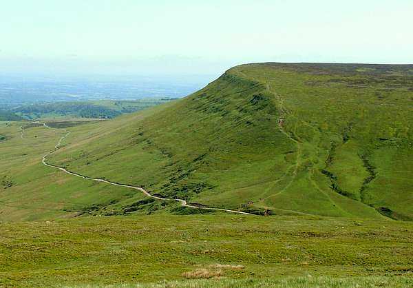 I arose at 7.45 for an 8.00 breakfast. When I am walking I try to have a substantial meal to start the day so that I do not suffer from low blood sugars half way through the morning, so I had muesli followed by a very good full breakfast. The B&B had been taken over by new owners only 6 months previously and they had done a lot of refurbishment, with nearly everything looking new. After packing my rucksack, I managed to set off at 8.45 and rejoined the route near the Darren Inn by 9.00. There is a steep minor road, then a track up to the top of the pass, then an even steeper path up the hillside towards the summit of Twmbarlwn until it starts to level off near the rounded hilltop. An old hill fort stands at the top and is checkpoint 4 on the route, which I reached at 9.45. This is a fine vantage point with views to the coast and of the hills round about, although it was still very overcast and grey. The weather was very close on the way up with no air movement, but higher up a cool breeze made it more pleasant. The steep climbs on the way up gave way to some very easy ridge walking with wide views across to the coast and over Newport, albeit rather grey in the prevailing weather conditions.