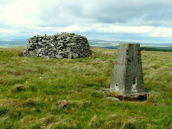 I stopped on Carnedd Llewelyn for lunch, still eating things that my wife had brought on Tuesday, and probably still having things left by the end of the walk. A few walkers came by the summit but, for a long time, I had it all to myself. After about 35 minutes I decided to press on, as I still had quite a long way to go. The whole landscape now changed from the stony mountains, often with steep cliff faces in parts, to a series of rounded green hills and valleys leading away to the coast. Even though the ridge was still at about 3,000 ft above sea level, it no longer gave that impression, although each summit along the ridge had its obligatory pile of stones at the top; the piles getting less and less at each one. The high ridge culminated at Foel Fras, a very level topped mountain beyond which was a fine viewpoint for the North Wales coast, from Anglesey and Puffin Island to the Great Orme and Llandudno, and around to Rhyl in the hazy distance. I could see the wind farm a few miles out to sea near Prestatyn, though it looked nearer to Colwyn Bay from this angle. I checked with my guidebook to see how far I had to go and was surprised to find it was only five and a half miles - I had been thinking that it was further than it was.
