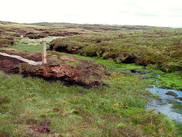 When Lance turned off I stopped for a rest until the rain returned and made me continue on my way. The mist started to fall over the hills, though not enough to block the visibility completely, so I was still able to see the next landmark of the twin radio masts near Foxhunter's grave. The two and a half miles to there across Mynydd y Garn Fawr do not provide the easiest walking conditions. The path is rough and stony running over a rather featureless heather moor, which had recently suffered from a fire, so it seemed an eternity before I reached the masts, following the path marked by wooden stakes.