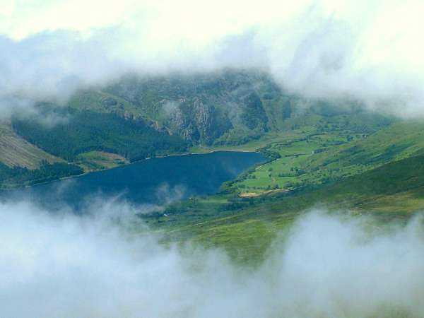 Llyn Cwellyn through clouds from Snowdon summit