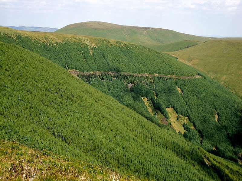 Though its name would suggest that it is a mountain, at 1,192ft Mynydd Machen falls far short of the 2,000ft to be strictly classified as such, but it does give some good views of the nearby valleys, once home to a large number of coal mines before they became uneconomic. Because of its flat top, though, it is necessary to walk a little round the edges to get the best views, which I did before continuing down the track towards Risca. On reaching the road, there is some confusion about the right of way, which the OS maps show as going past the nearby farm, whereas the guidebook shows it going across the field to the right of the farm, where there was a gate and a stile but no fingerpost or waymark. It looks as if the path has been diverted away from the farm but that this has not been updated on the OS maps. However, this was not a problem and I was able to find a wide stile looking more like a horse jump, where the path entered the forest. This has a tendency to get overgrown, and on this occasion that was the case, though it was still possible to make my way through the undergrowth and saplings without too much difficulty.