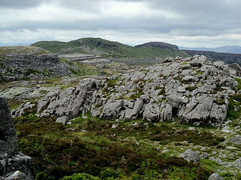 Lower down, it was getting quite hot, but when the track levelled off a bit beyond the waterfalls, there was more of a cooling breeze. Somehow I managed to miss the turning off the Watkin Path leading up to the Bwlch Main ridge. I could see where I wanted to be, but kept looking out for the Gladstone Rock, which is where the path goes off, and then found that I had obviously missed it and gone too far. As I had already climbed somewhat higher, I decided not to turn back, so I headed across to join the ridge further along. In some ways this was an advantage, as I left all the crowds behind and had the mountainside to myself for a while. There were mine workings to explore on the way and the only sound was of a trickling waterfall, as I stopped for a 20-minute rest and a drink before the ascent to rejoin Bwlch Main. There was a fine view of Yr Aran, the distinctive small peak to the south of Snowdon, and I could just see tiny specks of people making their way up the Watkin Path across the valley. As I was now further up the valley, the ridge was considerably higher and steeper than it was further down, so I had something of a scramble, which was not the easiest, to reach the top.