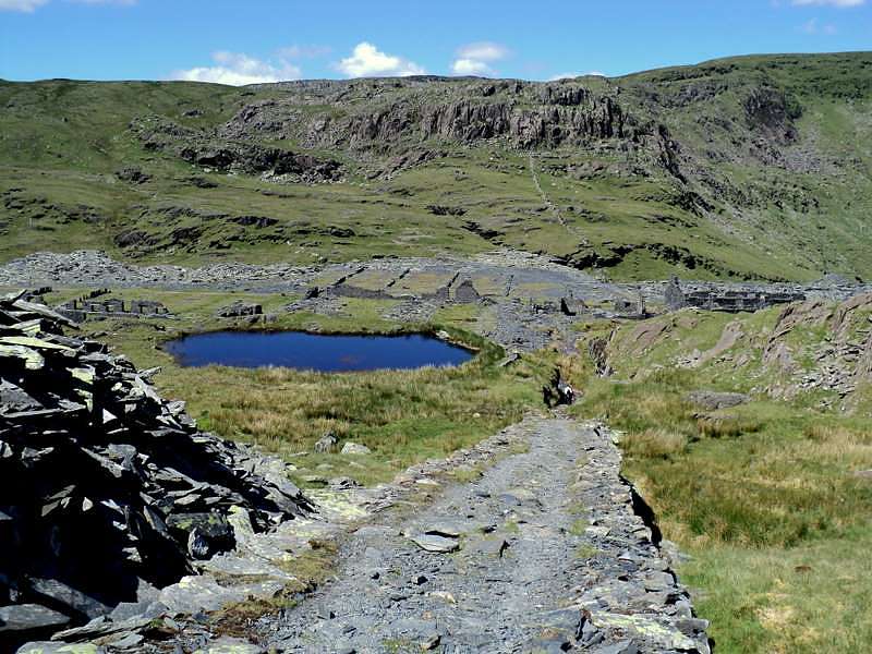 I set off at 9.10, making my way along the road for about a mile to rejoin the main route at the start of the Watkin Path up Snowdon. The hostel driveway was almost a quarter of a mile long, such is the size of the grounds, and there was a pavement by the side of the road for most of the way to the Watkin Path. The start of the ascent is fairly gentle and, although I wasn't feeling all that fit, I was able to keep up a steady pace on the wide track past the waterfalls. It was hardly surprising that, on a Sunday in summer with a very good weather forecast, there were many more people heading the same way, although what did surprise me was that there were also quite a few people coming down. Whether they had already been to the summit or whether they had just been up to the waterfalls or mines, I was not quite sure. Despite the fact that the track was as wide as a minor road, there were still a few large groups that ambled along taking up the whole width of the track, making it difficult for anyone to overtake them.