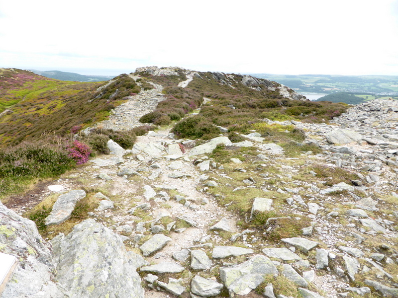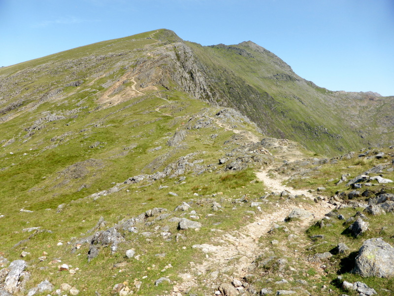 As I was not particularly pushed for time today, I spent about an hour near the summit, enjoying the splendid views lazing in the warm sunshine until I decided it was about time to move on. Normally, I would have stayed at Pen y Pass Youth Hostel, which is on the route and has the advantage of being nearly 1,000ft higher than Llanberis, thus reducing the amount of climbing the next day. However, the next day is quite a short one with only about 2,500ft of ascent, so it wouldn't be a problem to take a longer route from Llanberis, taking in extra mountains. The Llanberis Path roughly follows the railway and it relatively easy, though very busy, but then so are most of the other routes around Snowdon. I always find that the views from this path are less interesting than from other routes, but then I had already benefited from from the near perfect views earlier on, so it was just a matter of pressing on to my destination.