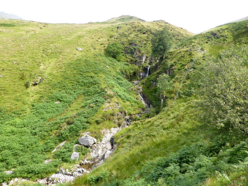 Even taking this safer route wasn't easy because there was so much water draining off the mountains across the pass. In some places this was flowing across the path in streams underneath floating bog similar to that which I encountered last night and with similar consequence. I went in up to my thighs a couple of times and up to my knees in other places. The difference this time, however, was that I was wearing my waterproof leggings. When I went into deep water, the pressure from outside pressed my waterproofs tight against my bare legs, as I was wearing shorts, and this stopped the water from flowing up my leg inside. This was quite effective so long as I was fairly quick at getting back out of the water again at the other side. Of course, my boots were soaking wet, but that was a foregone conclusion anyway.
