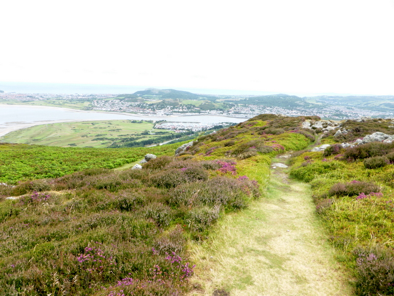 I rang my daughter again to tell her it would be more like 12.30 before I reached Conwy Castle, so that she didn't have to pay for parking whilst waiting for me, it being better for me to arrive first so that she could just pick me up from the castle car park. To conclude the route in style, there was one more peak to climb; Conwy Mountain. As mountains go this hardly qualifies, as it is only 810 ft high, but in every other aspect it is a fine mountain, giving excellent views of the coast and the Great Orme as well as overlooking Conwy itself, the Conwy Estuary and the castle. There are also the remains of an old hill fort on top with information boards. To add to it all, the purple heather was just starting to bloom, mixed with the yellow of the gorse to give a very colourful end to the walk, even though it was still somewhat overcast. Dropping down from Conwy Mountain, the town and castle were in full view until the route joined roads in a residential area on the way into town. I was just walking along the road to the castle when my daughter rang to see how I was doing. She had just finished some supermarket shopping so came to collect me a few minutes later along with my one month old granddaughter and we returned home, then went out to the local pub for a meal.
