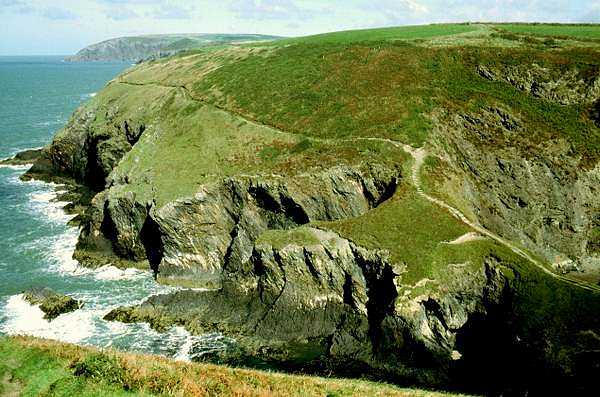 I found that it was possible to walk right over the natural arch, the narrowest part being about two or three feet wide, although I didn't stop to measure it! Stack Rocks nearby are also quite an amazing sight - tall limestone pillars standing a short distance from the cliffs and a safe haven for nesting birds. There are numerous other spectacular features created by the action of the sea and rain on the limestone including many sea caves and potholes. I came across one huge pothole with water at the bottom connected to the sea by a couple of narrow arches in the rocks. There were sheer vertical rock faces on all sides dropping down what I estimated to be over a hundred feet. All along there were many more spectacular features making this the highlight of the whole walk. Deep fissures in the rocks appear in many places, one of these forming an incredibly narrow inlet that is not noticeable until you are almost on top of it. It is aptly called the Huntsman's Leap - woe betides any that didn't quite make it.
