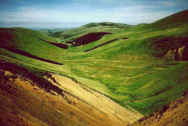 My next stop was at the mountain refuge hut near Lamb Hill at 1.30 p.m. where I met the first walkers of the day. They were a couple of women who were just setting off from there heading for Uswayford Farm. Mrs Buglass had said she was expecting two women that night, but she didn't think they were on the Pennine Way; in her letter one of them had signed her name as Lady somebody, so I had commented that she would have to be on her best behaviour, to which she had replied that they would have to take her as they found her. Soon afterwards a couple of day walkers came by as well, but didn't stop. Once again, the visitor's book in the refuge hut hadn't got many entries over the past few weeks. As I set off again, I could hear gunfire from the M.O.D. training area nearby and hoped that I wouldn't get caught up in the cross fire, although it is supposed to be safe outside the marked areas. It was still very hot and made worse from time to time as the breeze kept dropping. The scenery is less impressive at the southern end of the Cheviots but there are still some lovely valleys going off on either side of the ridge. As the ridge is rather flat-topped it is often necessary to make a little detour to one side or the other to get a proper view, although it is not possible to go too far to the east because of the M.O.D. area. I made a detour to the west which was well worthwhile, and I also went to the east as far as the warning notices by a cairn. Littered around the cairn were several .303 cartridge cases. They were all blanks, but about five of them had not been fired.