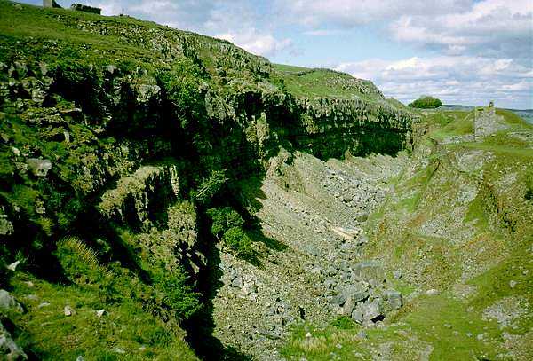 As it was a very pleasant evening, I decided to go for a walk to Gordale Scar, which is one of my favourite spectacles in this area. I called first at Janet's Foss which is almost on the way and then went on to Gordale Scar itself where I climbed up the waterfall and then up the steep scramble to the limestone plateau above. The climb up the waterfall was very easy as there was hardly any water flowing, so there was no problem about getting wet as is often the case. The huge overhanging cliffs looked just as impressive as ever and I made my way round the edge to get a view from a different angle.