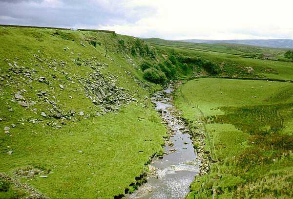 I got off to another leisurely start at about 9.30 a.m. with mist just hanging to the top of Standedge (about 1300 ft), but looking as if it might clear later. There was not much sign of activity from the two campers, although I could hear their voices from within their tent, so they were probably trying to summon up enthusiasm to get started. I made my way by the reservoirs over the moors, which do not give rise to any particularly good views as they lie near the moor tops. The cloud started lifting, so it made for quite good walking conditions. As I dropped down into the Wessenden Valley, however, there was a change to much more dramatic scenery with steep sided valleys and streams with waterfalls all brightened up by patches of sunshine. Walking along the path I came face to face with a cow, which was not unusual except for the fact that it did not move but held its ground making me have to skirt around it. Only then did I realise that it was a small bull and not a cow. However, it didn't take any more notice of me, but it did make me a little bit more wary about what animals were around.