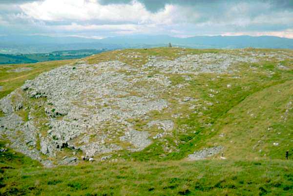 There was quite a fine view from Devil's Crag across the Lune Valley with the coast still in sight, and the Lake District in full view. I watched as a band of heavy rain passed several miles to the south, and the weather over the Howgill Fells was looking pretty bad, but it was still alright where I was, apart from turning very cool. The rest of the ascent to Castle Knott and then to Calf Top (1,998 ft) was thankfully more gradual and not too much of an effort to climb. I stopped for a short break at the summit where the scenery was looking very grey in the overcast conditions. It soon started raining, so I quickly put on my waterproofs but, by the time I had got them on, it had eased off to just a drizzle. The worst of the weather was now to the east, making the Yorkshire Dales look very bleak and drab. In contrast, the west was looking quite a bit brighter, with even the odd patch of weak sunshine here and there. Even the Howgills had lost the worst of their thick cloud.