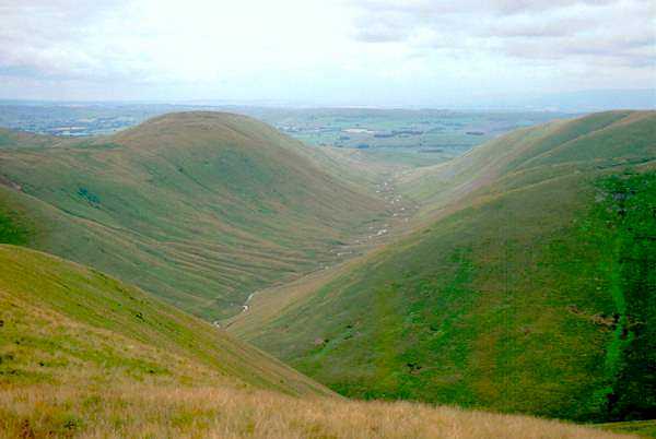 There is some superb ridge walking along the Howgills, with marvellous views in all directions, and an easy path to follow. The huge rounded flanks of the fells spread out below and there are moors and fells everywhere. I stopped for a lunch break at The Calf (2218 ft), getting a little shelter from the cold wind by the trig point, after passing a couple on the way huddled in a hollow for shelter. An inquisitive flock of sheep gathered round me, not scrounging for food, as often happens in well visited places, but just curious. Despite the cold and overcast weather conditions, visibility was still good and, from The Calf, the full panorama was now complete, with views to the North Pennines as well as all the ones visible earlier. It was now time to move before hypothermia set in, and I started to get a little relief from the wind as the route dropped down. I had resorted to hat and gloves as well as my fleece, but was still shivering as a group of five walkers passed by. A little detour from the route led me to the top of Cautley Spout to which a number of walkers were heading from the path below. After walking over the steep and uneven ground, my right heel started hurting far more than it had done earlier and this was because a large blister had burst. The reason I had got the blister in the first place was that my Montrail boots were badly designed, with folds and creases in the lining around the heel. I stuck a pad over it and hoped it would stay in place, which was wishful thinking, as they never seem to do so. I went down to the top of the rather impressive waterfall to watch the water cascading far below, then made my way back onto route again.