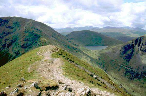 On my climb from the tarn towards Sergeant Man, I was passed by a lone walker who was just out for the day. There were lovely views back down to Easedale Tarn, then to Stickle Tarn and across Great Langdale. As I drew towards the summit, I could see the man who had passed me sitting there, so I stopped for a chat. He was a chef in the R.A.F. and was just about to retire to Llanrwst, where he was going to buy a house. We parted company, as I headed for Harrison Stickle, whilst he headed for High Raise. The path was not all that easy in places, as it was not very well trodden, but there were some lovely views along the way, albeit with dark clouds lingering round the higher mountains. The next port of call was Pike O'Stickle where I met a couple of people. This is quite a popular walking area, but by 12.15 I had only met four people, though there would probably be more later in the afternoon. A gradual descent on a fairly good path, apart from a few boggy patches, led me to Stake Pass. In one boggy place I managed to sink my foot in up to my ankle but, fortunately, not very much mud or water got into my boot.