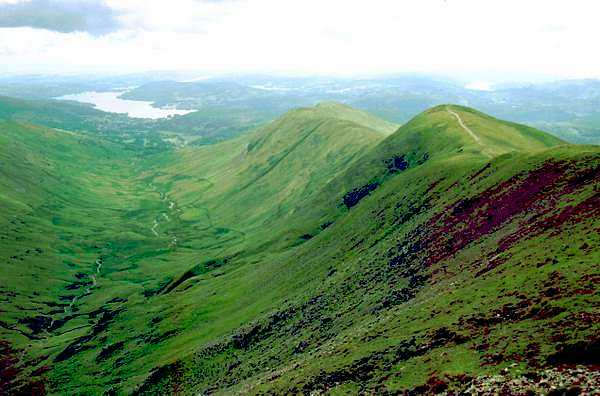 At the top of Fairfield is a large wind shelter which provided welcome relief from the biting wind, so I was able to have my lunch and sit looking at the view without shivering to death. I could see the route of the Coast to Coast walk going past Angle Tarn and up to Kidsty Pike, which made me wonder how Malcolm was coping. The descent of Fairfield via Great Rigg brings into view Lake Windermere, Esthwaite Water, Coniston Water and Grasmere, as well as Morecambe Bay and other parts of the coast. I could also see Easedale Tarn near the start of tomorrow's walk as well as most of the route to Grasmere. Further west, Great Gable was very prominent, and to the east Cross Fell could be seen.